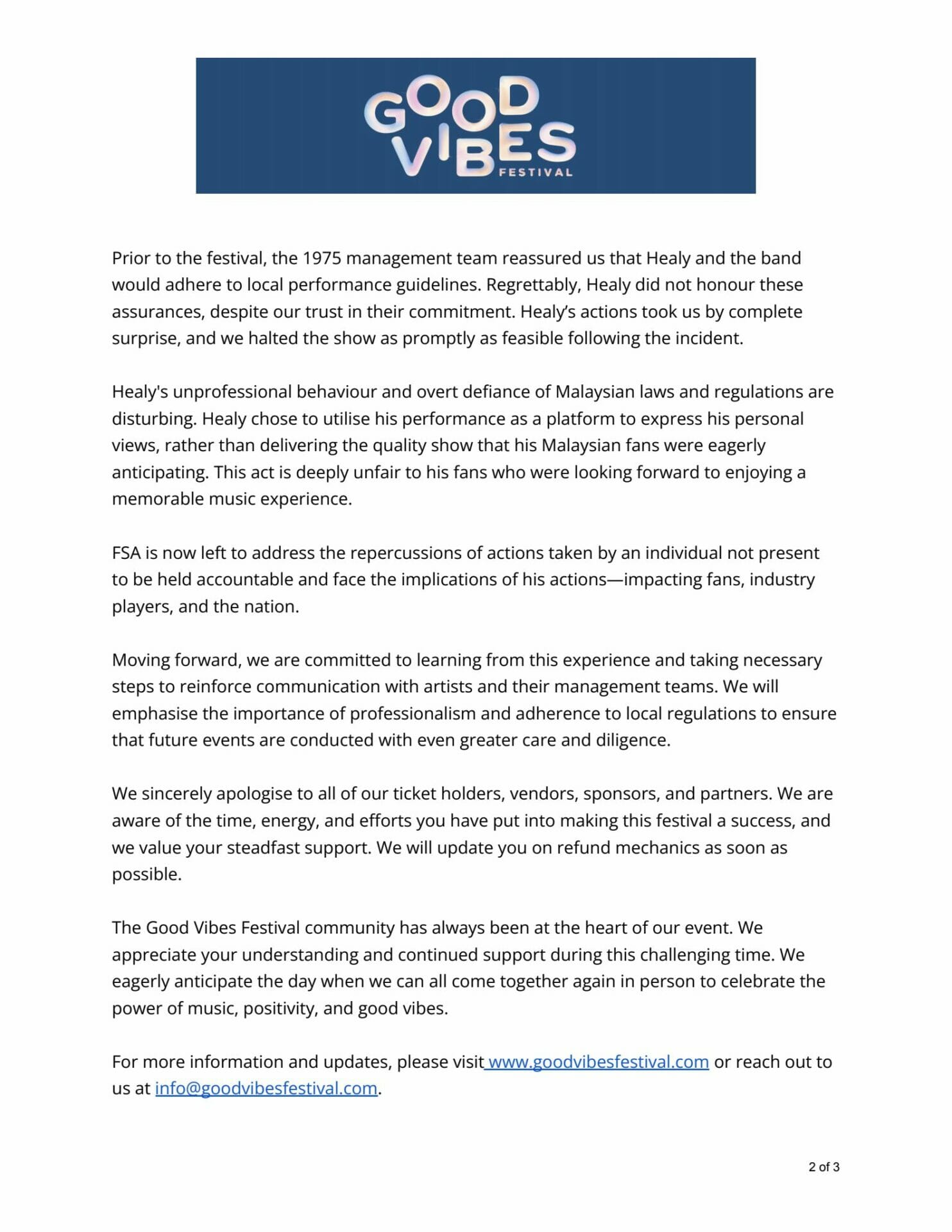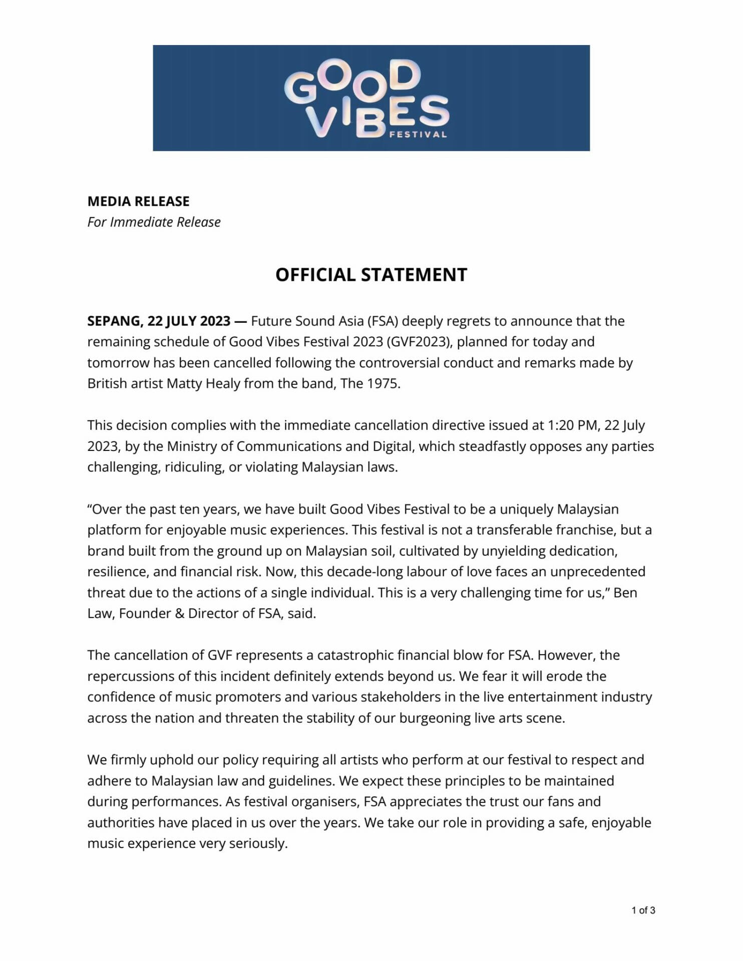 Berikut merupakan kenyataan rasmi yang dikeluarkan oleh Future Sound Asia selaku penganjur festival #GVF2023 :