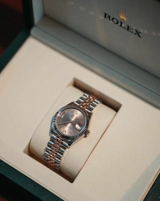 Tentang Rolex: Jam tangan Rolex Datejust 31 adalah gabungan elegan antara keluli tahan karat dan emas ros 18K, memberikan sentuhan mewah pada reka bentuknya. Dengan diameter 31mm dan ketebalan hanya 10mm, jam ini hadir dengan kesan yang klasik namun tetap moden. Dihiasi dengan dial berwarna merah jambu yang menawan, ia dipadankan dengan nombor Roman yang digarap dengan kemas dalam emas ros 18K, serta tangan yang juga diperbuat daripada emas ros, memberikan kontra yang anggun. Pergerakan automatik Rolex Caliber 2235 memastikan ketepatan waktu yang sempurna, manakala ciri COSC menjamin ketepatan lebih tinggi dengan status Swiss Official Chronometer. Dilengkapi dengan kerah berulir (screw-down crown) untuk ketahanan yang lebih baik dan kalis air, menjadikan jam tangan ini bukan sahaja bergaya tetapi juga praktikal.