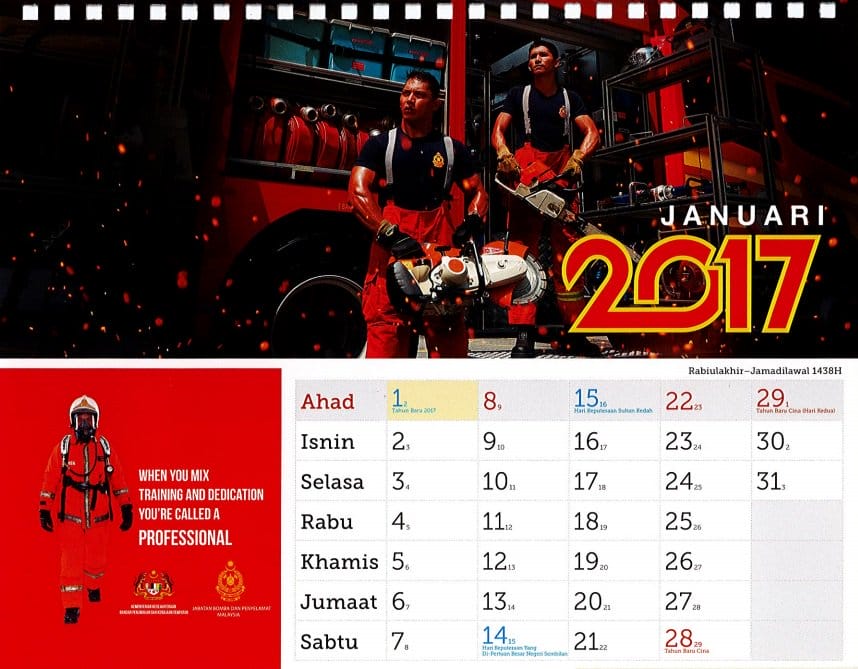 Muka hadapan kalendar 2017 Jabatan Bomba & Penyelamat (JBPM)