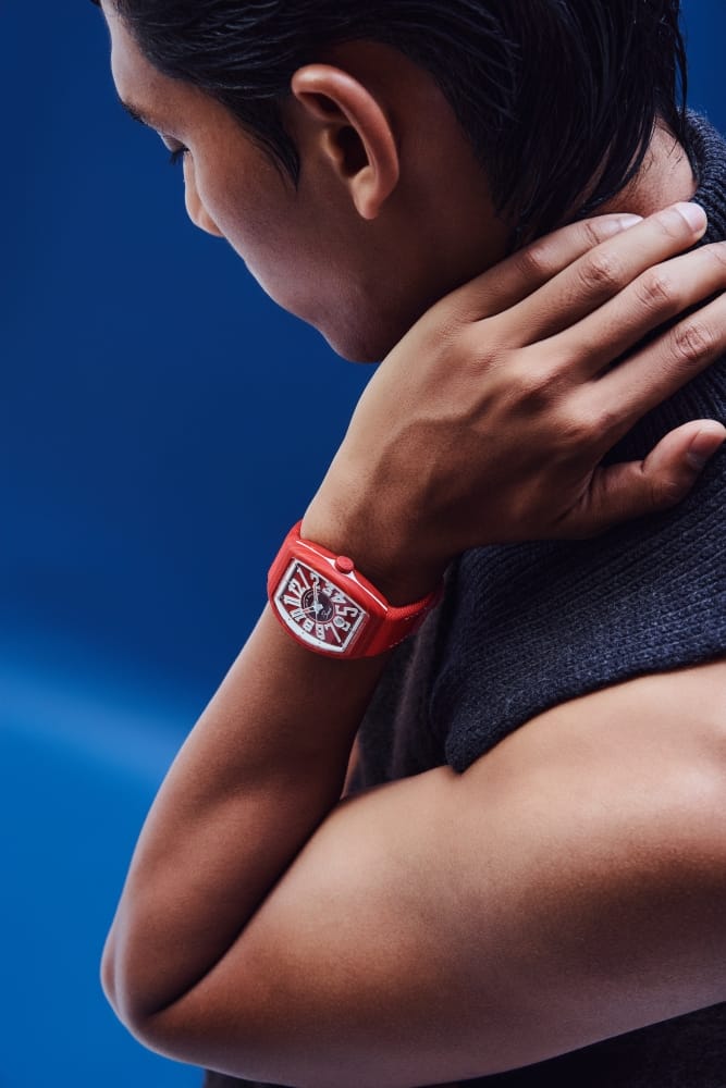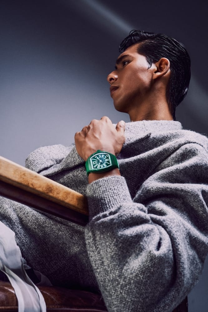 Koleksi jam tangan kontemporari Vanguard Beach terbaharu ini hadir dalam tiga pilihan palet warna yang bold; merah bara, biru lautan dan juga hijau musim panas. Jam tangan monokromatik ini melantangkan la dolce vita dengan sentuhan sukan sporty chic, dalam padanan warna yang fashion forward dalam desain jam Franck Muller ikonik.