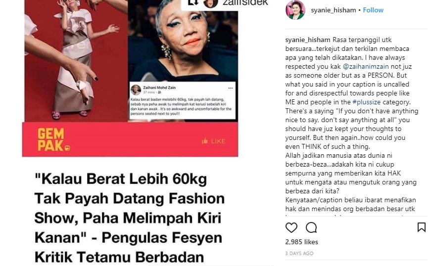 Walaupun tidak dilantun secara spesifik, namun tindakan Kak Zai atau pun nama sebenarnya, Zaihani M Zain menyelar secara terangan serta menasihati individu-individu berbadan besar agar tidak hadirkan diri ke mana-mana pementasan fesyen, nyata mengundang rasa tidak senang kebanyakan netizen, terutama sekali dari komuniti ‘plus-size’.