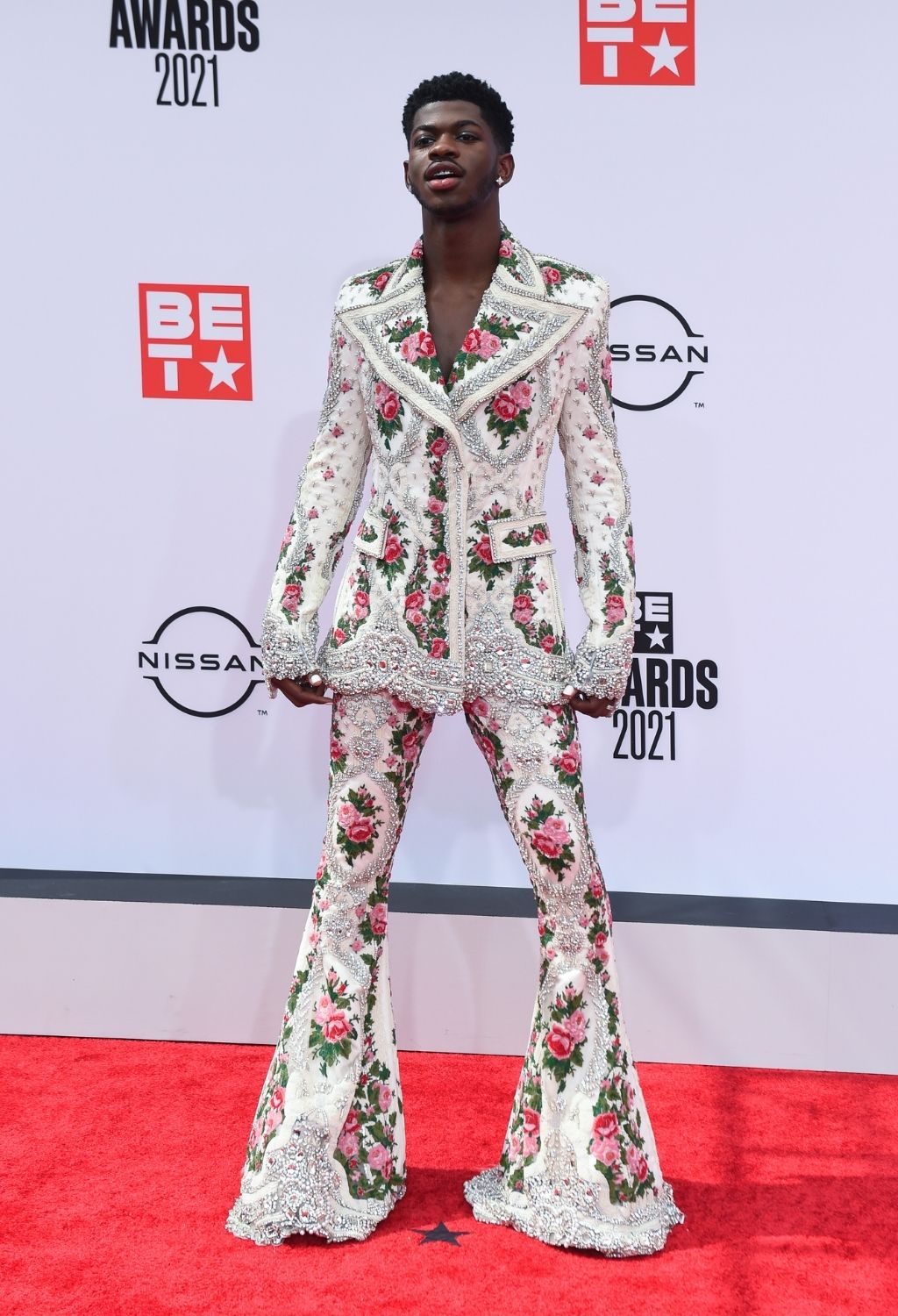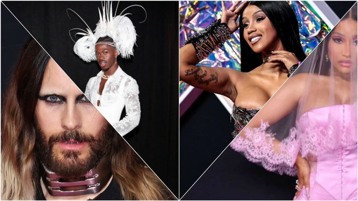 Lil Nas X mencabar gaya maskulin dalam paduan dua stail yang cukup feminin. Pertama adalah ciptaan Andre Grossi yang lengkap dengan skirt, jaket dan korset. Gaya keduanya pula adalah sut sarat tenunan bunga ilham Richard Quinn.