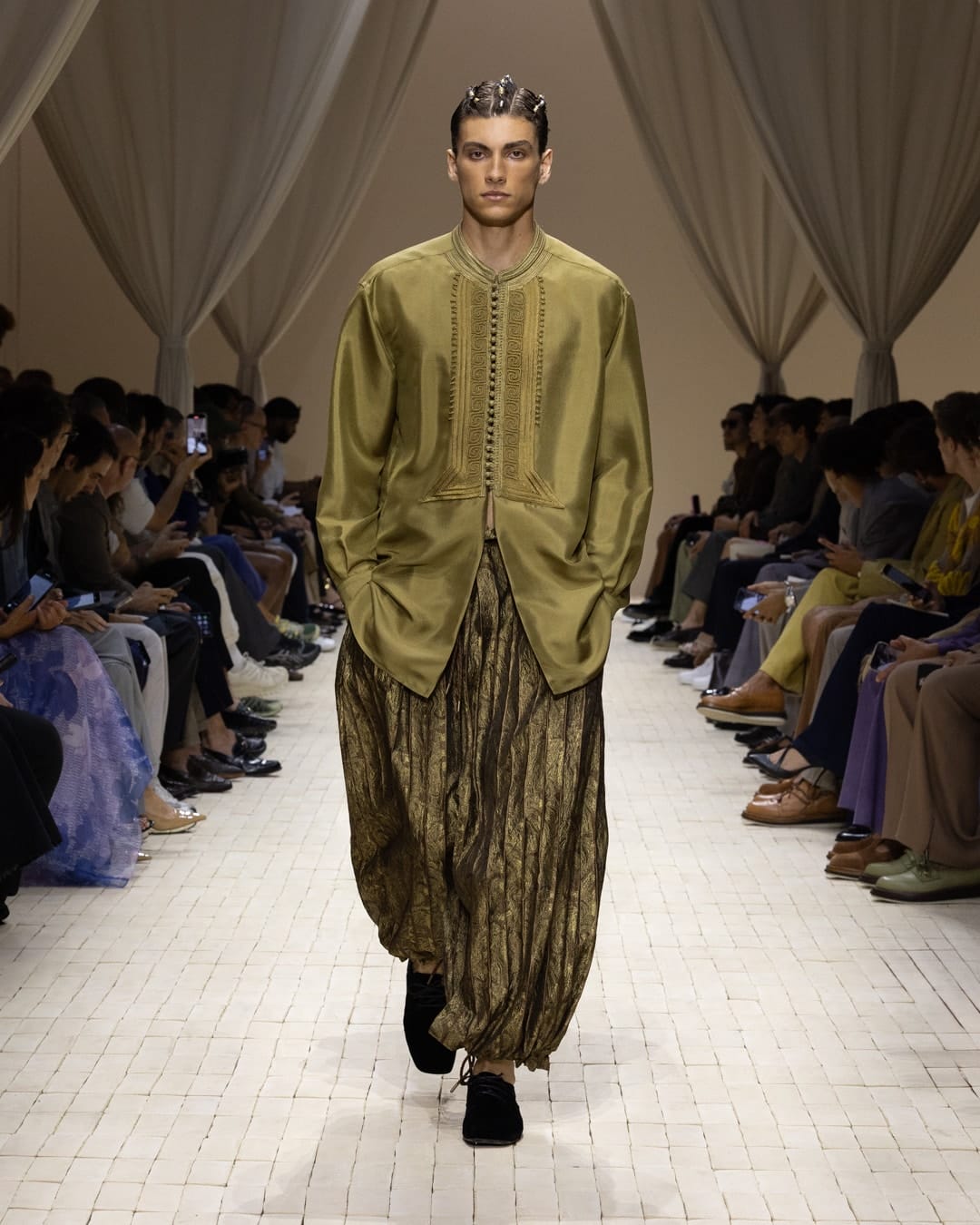 Antara perkara paling menarik perhatian dalam fesyen musim panas lelaki kali ini adalah asas potongan baju, dari segi tekstur kain dan pemilihan material. Kain dengan potongan longgar ke bawah, lut sinar, atau melekap lembut pada tubuh seperti kabus. Bayangkan linen ringan, rajutan nipis, sutera matte, dan mesh yang bermain dengan sedikit pendedahan kulit namun masih penuh dengan kesopanan. Pakaian ini menjadi kulit kedua atau kadang-kadang merupakan lapisan perlindungan yang tidak kelihatan. Ia bukan tentang tarikan seksual, tetapi tentang intimasi dan rasa kemanusiaan. Potongan baju juga mula berubah sedikit demi sedikit meninggalkan struktur ketat dan tted, bahu dijatuhkan, silhouette membulat dan memberi ruang kepada pergerakan. Ia seperti pakaian yang dibentuk oleh tubuh, bukan mengawal tubuh.