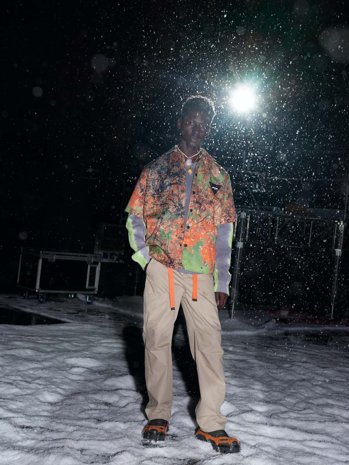 Helaian luaran yang dapat dipakai dua sisi serta jaket berpotongan tegas dengan gaya padded bernuansa maskulin mendominasi beberapa gaya awal yang disuguhkan. Cetakan pop memenuhi beberapa potongan kot, jaket serta vest yang dipadukan di atas material warna gelap dan bold di cemerlangkan dengan deretan aksesori yang kontra. Nuansa warna pastel, seperti ungu, biru, dan hijau neon antara taruhan utama.