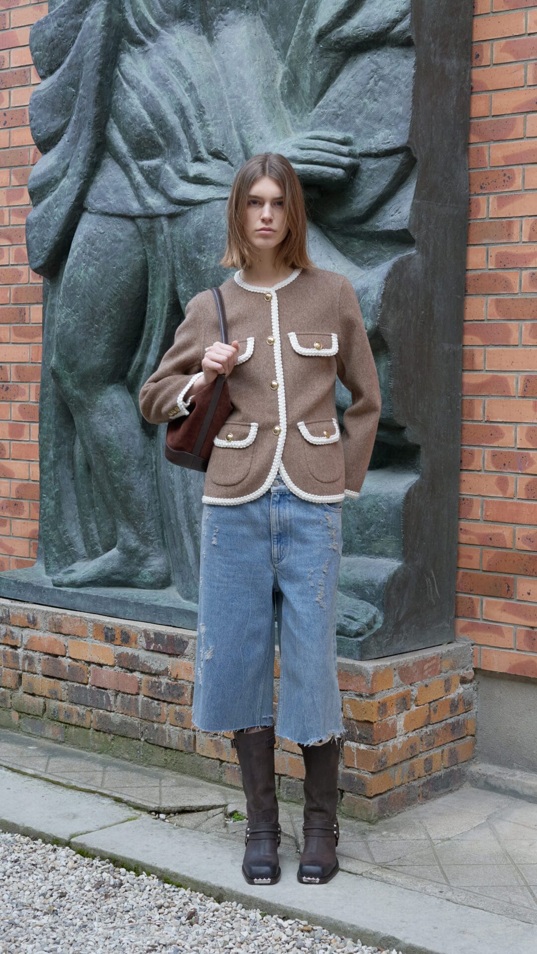 Sandro mengangkat tema “Express Yourself”. Sebuah koleksi yang mengajak wanita merangkul semula erti seragam dengan cara baharu. Dari helaian yang diinspirasikan kelab eksklusif, seperti cable-knit sweater dan skirt berlipat, hinggalah reinterpretasi jaket klasik dalam kanvas, wool dan denim, Sandro menghadirkan semangat sporty-elegan yang santai namun tetap berwibawa. Siluet pula dilepaskan daripada aturan lama. Kali ini lebih bebas, bertenaga dan dinamik. Palet warna hijau emerald, putih bersih dan kuning lembut bertemu dengan nuansa kulit coklat lusuh mencipta kombinasi yang segar tetapi tetap timeless.