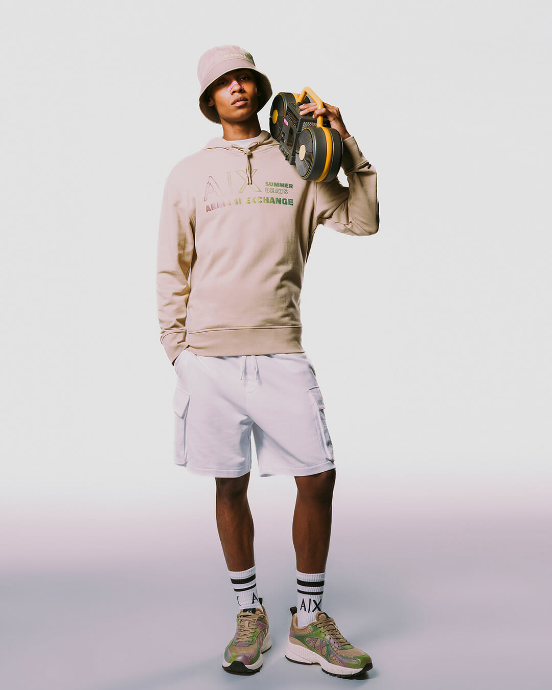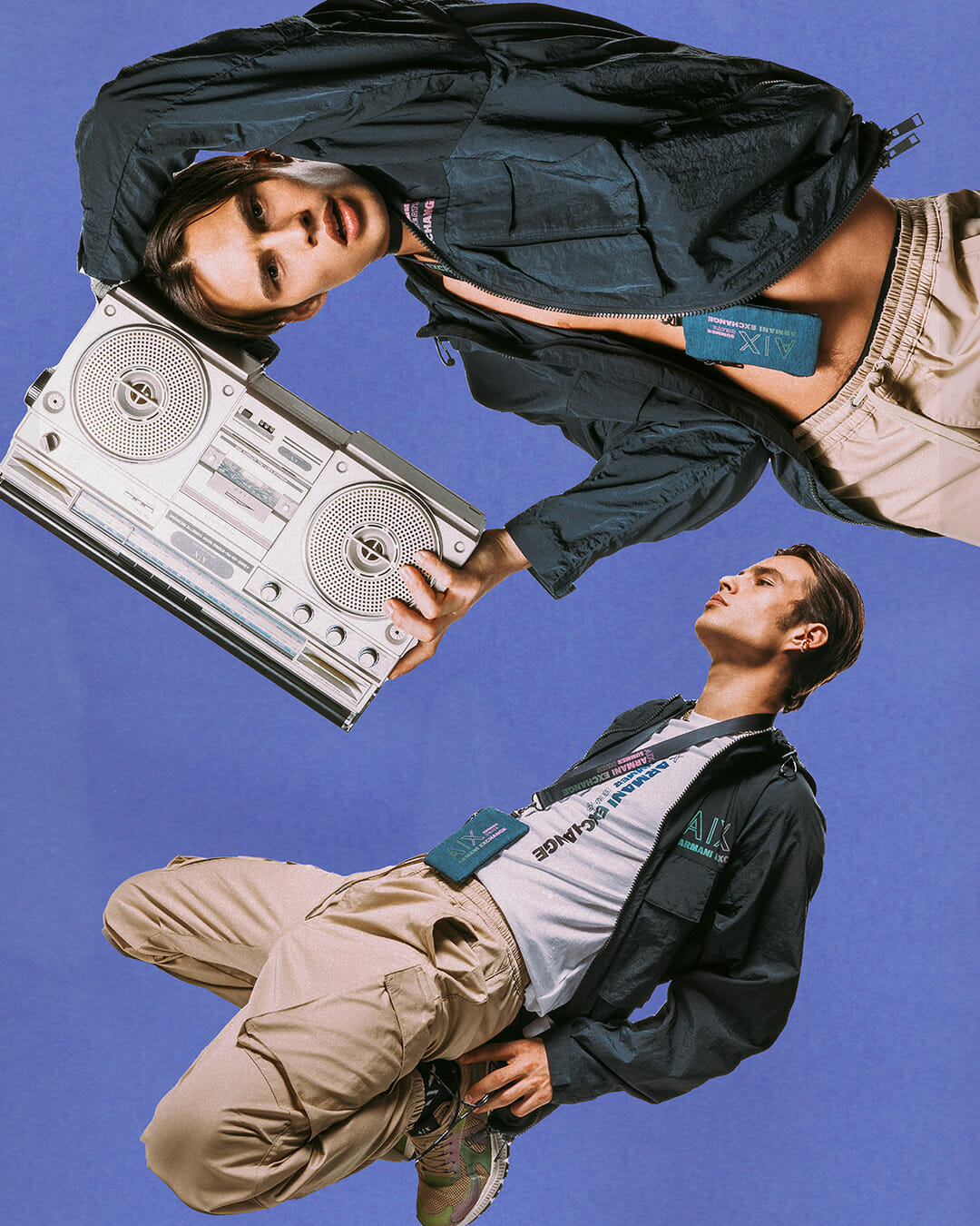 Elemen muzik menjadi simbol selebrasi musim panas Armani Exchange, ditambah dengan garis gaya yang menjadi representasi dari kekuatan dan keberanian. Muzik sebagai momen yang memperlihatkan pergerakan bebas dan set pakaian yang ditawarkan Armani Exchange pula mengiringi tema tersebut.